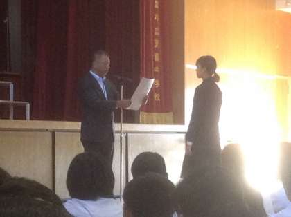 10月24日、体育館で全校集会を行いました。まず最初に、総合文化祭で活躍した茶道部の表彰式があり、校長先生からは、今週末にある文化活動発表会に向けて準備はできていますかと問いかけられ、3年生の取り組みの姿を後輩が追いかける、是非とも伝統の行事を後輩にしっかり引き継いでくださいねと激励がありました。