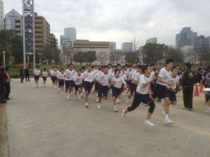 12月20日、本日は午前中の時間帯を活用して扇町公園で恒例の長距離走記録会を開催しました。全校生徒を4グループに分け、女子は公園の周りを6周、男子は10周走りました。開会式では校長先生から3つ留意点が延べられました。一つ完走を目指す、二つ新記録を出し、記録を塗り替える、三つ体調が悪くなったときは無理をしないと。生徒たちのほとんどは時間をかけても完走しました。そして、2年生の男女が新記録を出しました。2年2組の松原くん、2年2組の安さん。よく頑張りました。生徒たちの頑張りには自然と拍手と声援が送られました。また、安全確保でPTA役員、実行委員のみなさまにはご協力をいただきありがとうございます。次は、12月22日に扇町公園を使用させていただいたお礼を込めて公園の清掃を行います。いつも天満中の応援に感謝をこめて。
