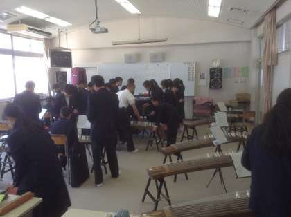 3月17日、1年生の音楽の授業で和楽器として『箏』の演奏を行っています。最初に合唱の練習をした後、自分たちで箏の準備を行い、早速、練習に励んでいました。さくらさくら〜と中々上手な生徒もいました。