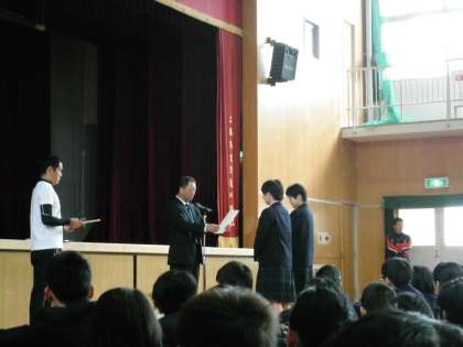 4月17日、全校集会で学級委員の認証式が行われました。代表として、各学年1組の委員長が認証状を受け取りました。その後、バレーボール部、テニス部の表彰式を行いました。校長先生からは、生徒手帳に記載している学級委員の仕事に自分だからこそできるプラスワンを付け加えてくださいとお願いがありました。また、「達成力」という本から『若い人へのメッセージ』を紹介され、社会で活躍している人の言葉を集約すると天満中のめざす子ども像につながっていると説明されました。生徒たちは「メッセージ」のプリントもらっていますので、家庭でも話題にしてみてください。