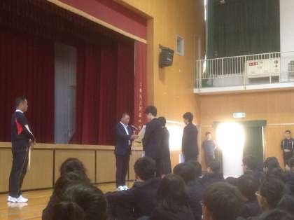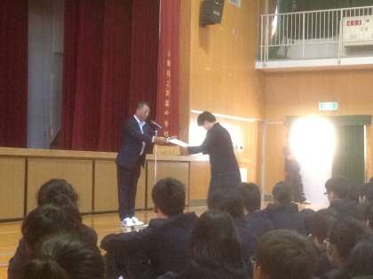 5月8日、本日の全校集会では陸上部、バレーボール部の表彰式がありました。この連休中も多くの部活動が頑張っていました。校長先生からは、来週には1年生にとっては初めての中間テストがあります。気持ちを切り替えて学校生活を送るようにと話があり、続いて「金の言葉、銀の言葉」と書かれたプリントが配布されました。そこには『見えないところで伸びると信じる』という言葉が記載されていました。これは、作家百田尚樹さんの「ボックス」という青春小説から引用されたものです。この一言には、あらゆる物事の真理があると。さらに、5月8日は「いじめについて考える日」でもある、いじめをなくすには自分が何をすべきかと一人一人が自分に問うことが大事ですねと、NHKいじめを考えるキャンペーンでの100万人の行動宣言についてのお話もありました。