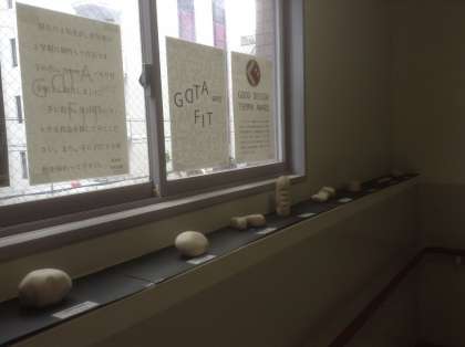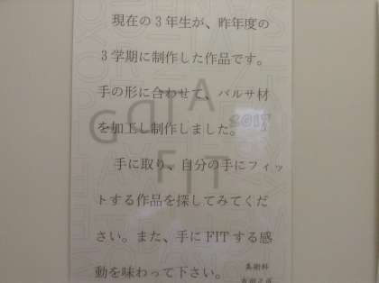 現在、3年生が2年生の3学期に作成した作品を階段の踊り場等に展示しています。バルサ材を手の形に合わせて加工したものです。各自の手にフィットするように作られています。優秀作品は「グッドデザイン賞」として全校集会で表彰される予定です。
