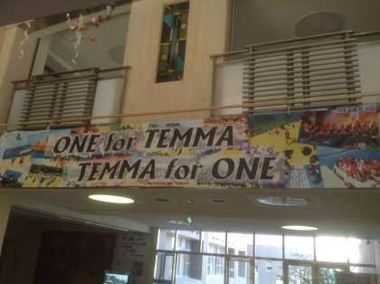 9月26日、PTAのご協力により、学校全体のスローガン幕が完成しました。体育大会のスローガンは『天満の絆、みせたろや』ですが、年間を通して学校全体としては『one for Temma Temma for one』です。9月29日の体育大会に間に合いました。この2つのスローガンのもと、熱い体育大会を期待していてください。