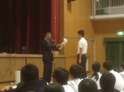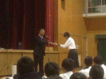 10月16日、本日の全校集会では陸上部、美術部の個人表彰がありました。その後、校長先生からは、本日のテーマ「歌の力」についてお話がありました。ある新聞記事で音楽の力を次のように説明していると。「書物は、すごく良い内容と言われても、意識しないと読まない。でも音楽は違う。心を閉ざしていても勝手に聞こえてくる。その力はすごい。さらに、はやり歌は必ず思い出の目次にもなる」10月27日には、文化活動発表会がある。もうすでにその練習が始まっている。歌声だけではなく、心から思いを届けようとするから見ている人の感動を呼ぶ。是非とも、すばらしい文化活動発表会になるよう期待していると締めくくり、最後に「あと一歩」という曲を映像とともに聞きました。苦しいことがあってもあと一歩で乗り越えられると信じようと。歌詞の一部を紹介します。「何度も何度も倒れても 立ち上がる意志が虹を呼ぶ」