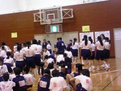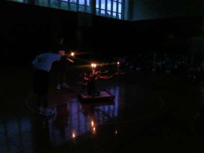 (上)キャンドルファイヤ、(中)○×問題、(下)先生とのじゃんけんリレー