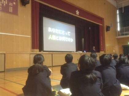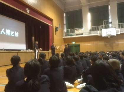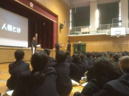 12月4日、全校集会で第63回大阪市青少年読書感想文コンクールで市長賞と学校図書館協議会賞をとった2名の生徒、アイデム写真コンクールで表彰された2名の生徒の授与式が行われました。その後、校長先生からは12月4日〜10日までの人権週間の説明と「あなたにとって人権とは何ですか」の問について考える人権学習が行われました。映像を見ながら『人権』という言葉の意味を全校生徒が自分なりの言葉を見つける機会になったと思います。そして、全体スローガンの「One for Temma Temma for One」を大事にしていきましょうとお話を締めくくりました。