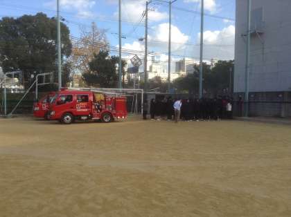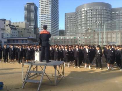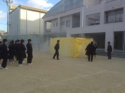 12月6日、6限目に北消防署のご指導のもと全校生徒対象に避難訓練を行いました。緊急放送後、グランドに集まるまでの時間は非常に短くよくできていました。その後、消防署の方のお話にも真剣に聞いており、将来の防災リーダーとして成長が楽しみです。引き続き、1年は水消火器、2年は心肺蘇生、3年は煙トンネルくぐりを体験しました。