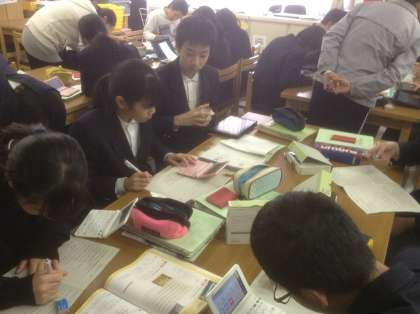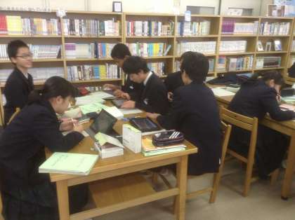 2年生の英語の授業では、英語でのプレゼンテーションに挑戦しています。タブレットと電子辞書を使いながら、英文を必死で作成しています。まさにグローバルな時代に必要なスキルですね。