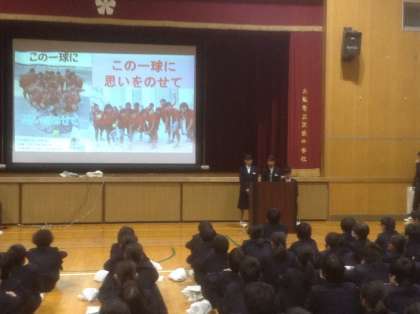 12月18日の全校集会では、読書活度の活性化の一環として「部活動別読書活動推進ポスター」投票会を行いました。各部活動が、それに関連する本をパワーポイントを使って紹介しました。どれも、部活動に関連していて興味がわきました。さて、どのポスターが選ばれるか楽しみです。
