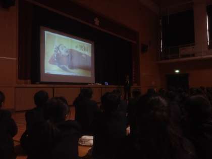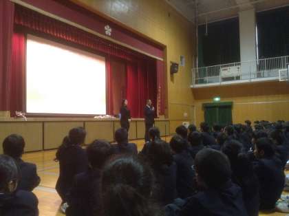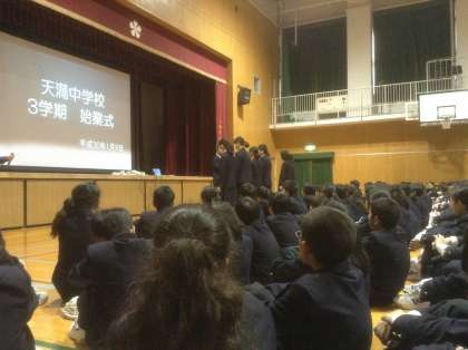 1月9日、全校生徒が元気な顔で登校してきました。いよいよ3学期が始まります。本日は、体育館で始業式行われました。最初にC−NETの新しい先生の紹介があり、吹奏楽部、テニス部の表彰の後、校長先生から1月1日のある新聞記事が紹介されました。考える力、共創する力、進化する力が大切ですと。最後に、夢は、志は、2018年にやるべきことはという質問にどれだけ答えることができますかと投げかけました。3年生にとっては、進路まっしぐらですね。天満中の教職員は、全力で皆さんを応援しますよ。
