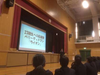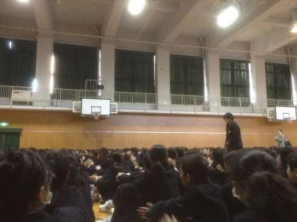 2月5日、本日の全校集会では、最初に地域から感謝の報告があったと校長先生からお話がありました。先週金曜日の2月2日の夕方に、マンションの駐輪所で小さいお子さんを乗せた自転車が転倒しているところに、本校の2年大塚さんが駆け寄り手助けをしたということです。この勇気ある行動に拍手を送ります。続いて、校長先生からは、今週末に私立高校を受験をする3年生に向けて、応援歌の紹介がありました。この歌詞には勇気づけられると。曲名は、ベリーグッドマンの『ライオン』です。受験は団体戦、23期生の皆さん、お互いに全力を尽くしましょう。