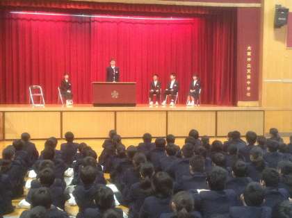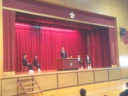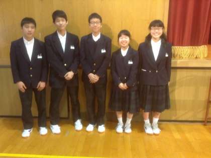 3月20日、4限目は体育館で平成30年度前期生徒会役員選挙が行われました。5名の勇気ある立候補者が、自分の考えをしっかり述べていました。演説前には、校長先生が生徒手帳に記載している生徒会会則を読み上げ、責任を持って投票しましょうとお話がありました。新年度から、新しい生徒会役員の活躍が楽しみですね。