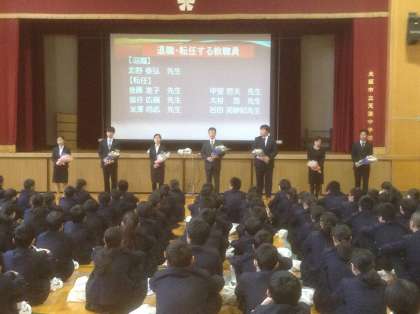 3月29日に平成29年度の離任式が行われました。校長先生から、離任される先生の紹介があり、一人一人の先生がお別れの言葉を述べられました。出会いがあれば別れがあります。「さよなら」の言葉の数だけ成長すると言われますが、やはり別れはさびしいものです。お世話になった先生方の今後のご活躍をお祈りしています。ありがとうございました。