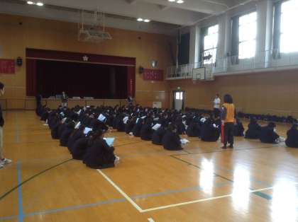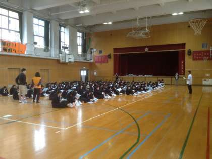 5月8日、6限目に1年生は体育館で明日から始まる自然体験学習の最終確認をしました。行先は京都宮津にある海洋センター『マリーンピア』です。明日の集合時間は8時です。忘れ物がないようにもう一度持ち物の点検をしておきましょう。すべては「しおり」に掲載してありますよ。
