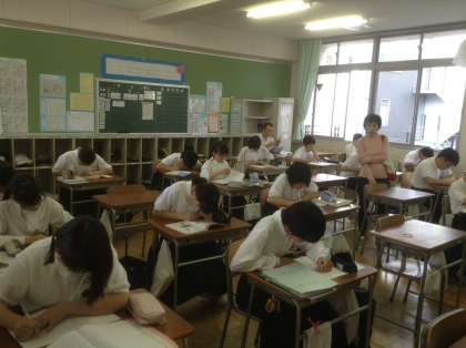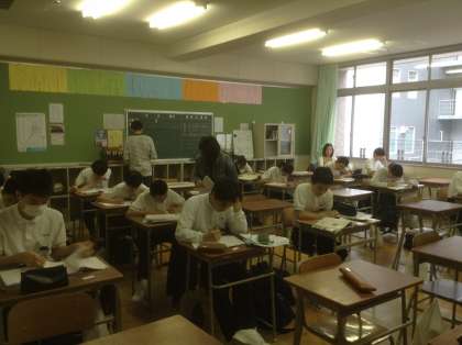 5月19日土曜日9時30分から11時20分まで、テスト前土曜学習会を開催しました。1年生から3年生まで89名の生徒が参加しました。これは、本校のコミュニティスクール事業として平成21年度からスタートしています。本校の地域コーディネーターの方々が企画運営していただき、大学生等の学習支援ボランティアも参加し、生徒の学習をサポートしています。この事業の主旨は、生徒たちの自学自習を育み、家庭での学習習慣を身に付けるために行っています。当日はPTA役員の皆様もお手伝いに参加してくれました。多くの関係者の皆さんによって、本校の生徒が支えられていることに感謝します。