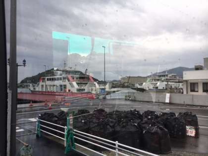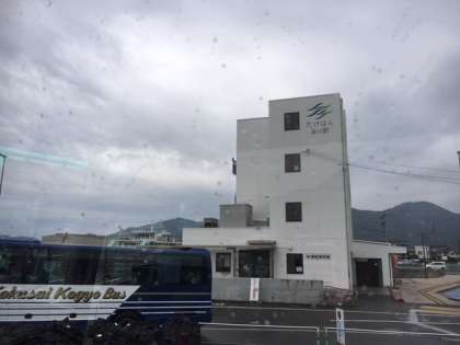 バスが港に着きました。小雨のため、昼食はバスの中で食べることになりました。
