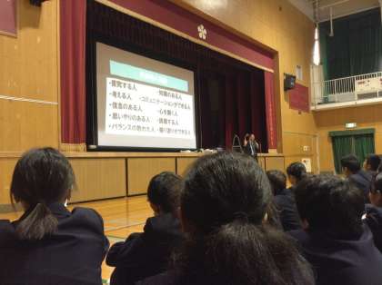 11月26日、体育館で全校集会が行われました。校長先生のお話のテーマは「挫折から得られるものは」でした。校長先生の失敗談から始まり、本校の目指す子ども像の確認、先輩方の「失敗を恐れず挑戦する」のアンケート調査項目結果が、年々「そう思う」が増えていると説明がありました。最後に、困難を乗り越えてきた人々の言葉が紹介されました。そして、明日からの期末テストに向けて意欲を高めようとお話を締めくくりました。今日から3日間、困難にもめげずテスト勉強に励みましょう。やればできるは魔法の合言葉ですよ。