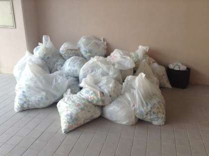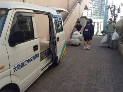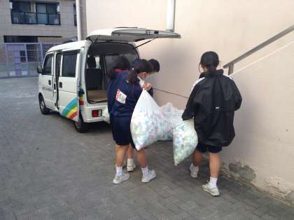 12月18日、放課後に大阪市立中央授産所の方が、本校で集めた「ペットボトルキャップ」の回収に来てくれました。平成28年度は232.4kg、平成29年度は260kg、平成30年度は246kg集めることができました。これも生徒、保護者、地域の皆さんのご協力の結果です。ありがとうございました。これらのペットボトルキャップは換金され「世界のこどもにワクチンを日本委員会(JCV)」に寄付されます。回収時には水泳部の皆さんが協力してくれました。