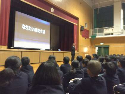 2月4日、全校集会が体育館で開催されました。最初に長距離走記録会の表彰がありました。総合優勝は1年3組、2年1組でした。男女とも個人表彰が8位まで行われました。続いて、校長先生からは「理想の自分は」というテーマでお話がありました。理想に近づくためには挑戦する勇気を持とうと。