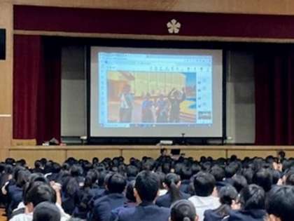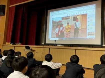6限終了後、3学年が体育館に集まり現地ガーナとオンラインで結びました。