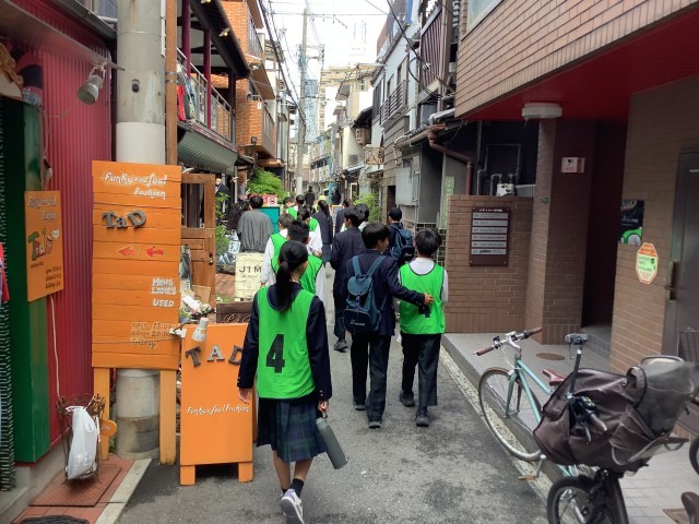 「地域を知る」一環として中崎地区を探索し、清掃活動を行いました。活動中に見つけたゴミから地域の課題を分析し、住みよい町づくりに向けて、中学生として何ができるかを深く考える機会となりました。