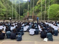 野外炊飯では、カレーライスづくりが順調に行なわれています。一方で、汚れた作業台やこれからカレーライスが並べられるテーブルを丁寧に拭いてくれている生徒たちもいます。美味しさの中にはこのようなことも溶け込んでいます。