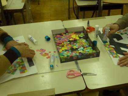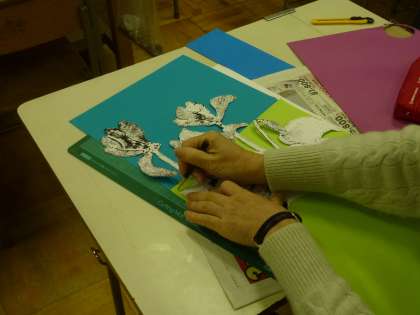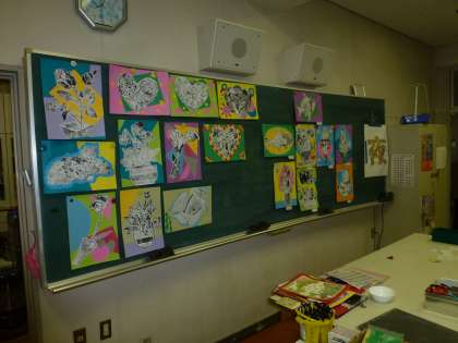 授業風景 (美術) 公開日 2015/03/09 更新日 2015/03/09 お知らせ 今年の美術の授業ではアクリル絵の具で色彩(しきさい)の勉強をしたり、ランプシェードや羊のオブジェを作りました。3学期は版画の制作をしました。材料に段ボールやあみの切れ端、革(かわ)の切れ端などを使いました。背景の色画用紙に、黒いインクが映(は)えて、とてもきれいな作品ができました。 上は版画の制作の様子、中は全員の作品の鑑賞会の様子。 下の画像は、「夜間学級生募集中」のはり紙の制作の様子です。 いいね(0)