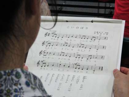 古くて懐(なつ)かしい歌が多く、みんな昔のことを思い出しながら、楽しく歌っています。