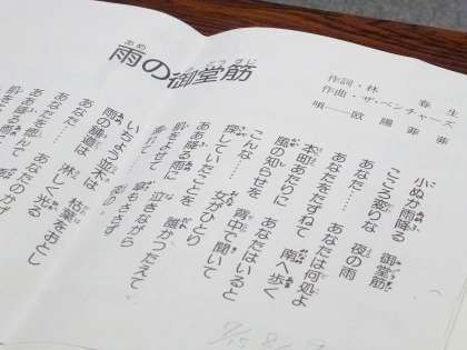 もう一曲(いっきょく)は『雨の御堂筋(みどうすじ)』という、懐(なつ)かしい曲で、本町(ほんまち)、梅田(うめだ)、心斎橋(しんさいばし)などの大阪市内(おおさか・しない)の地名(ちめい)が出てきます。