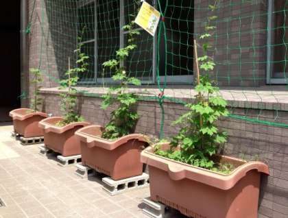天満中学校(昼間)では、毎年5月に、1年生、2年生、3年生の全クラスがゴーヤの苗(なえ)をプランターに植え、当番が毎日水やりをします。6月中旬には、ここまで伸びてきました。