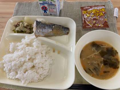 きょうの給食は、さごしのおろしじょうゆかけ・みそ汁・野菜いため・ごはん・牛乳・おさつチップスでした。