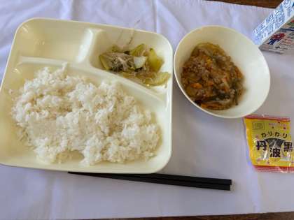 テスト終了後の2年4組では、試験の緊張を吹き飛ばすかのように楽しそうに配膳を進め、「いただきます」の声が教室に明るく響いていました。