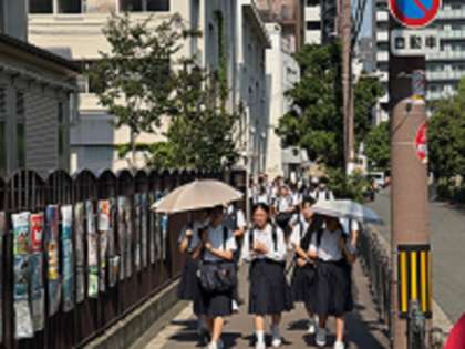 梅雨とは思えない強い日差しの下、生徒たちは汗をぬぐいながら登校してきます。