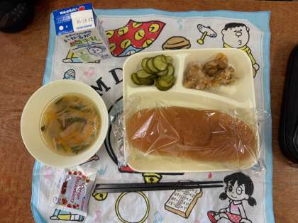 7月最初の給食は、鶏肉のからあげ・ハムととうがんの中華スープ・きゅうりのピリ辛あえ・パン(イチゴジャム)・牛乳でした。