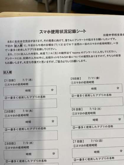 生徒会からは、スマホの使用状況についてのアンケートがありました。2学期に行われる生徒会交流会にて報告するための調査とのことで、自分のデジタル機器の使い方について見直す良い機会になればと思います。