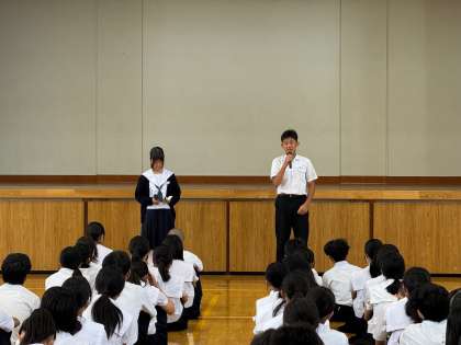 集会の締めくくりには2組の学級委員長が登壇し、「3年生にとって夏休みはとても貴重な期間です。懇談で得たアドバイスを基に計画を立て、充実した休みにしましょう」と呼びかけました。