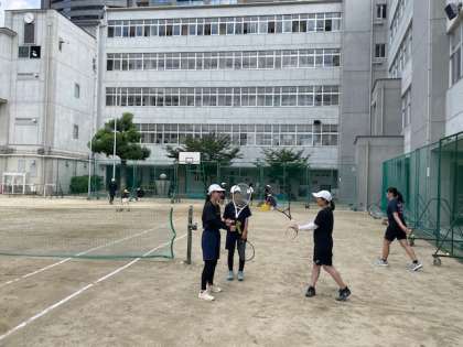 グラウンドでは女子テニス部顧問が、部員にフォームについて手取り足取り熱心に指導されていました。部活動指導員さんも来られ、指導が充実している様子でした。