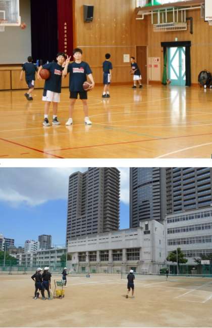 吹奏楽部——グラウンドではマーチングの隊形練習、音楽室ではパートごとの個人練習を並行して実施。