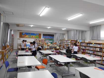 本日(7月23日)、読書部は学校司書さん・顧問の先生と協力し、図書室の蔵書点検を実施しました。