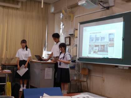 旭陽中学校で開かれた2ブロック生徒会交流会に3名が代表として参加し、『スマホに関するいじめを防ぐために取り組んでいることや取り組みたいこと』の発表と自校の生徒会活動の報告を行いました。