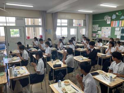 2年2組では、きょうから教育実習に来られた先生も一緒に教室に入り、みんなそろって「いただきます!」をしました。