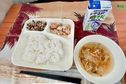 きょうの給食(さけのしょうゆだれかけ・高野どうふのいり煮)