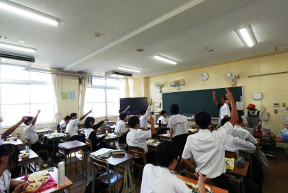 In Class 3-4, a cheerful rock-paper-scissors game broke out to decide who could claim the extra side dishes—then a big, happy “Itadakimasu!” echoed through the room.