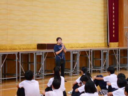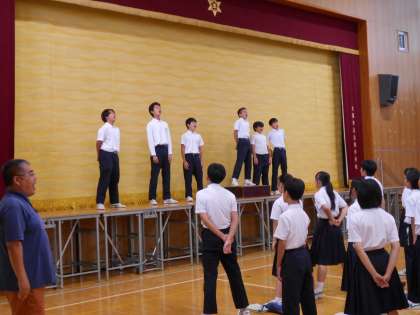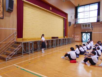 その後、学年全員で「わっしょい」の発声練習を行いました。各クラスの代表が前に立ち、「せーの!」の合図とともに「わっしょい!」の声が体育館に響き渡りました。最後は先生たちも一緒に声を出し、明日に向けて士気を養いました。