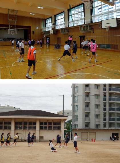 保健体育では、女子はサッカー男子はバスケットボールに取り組み、屋内でも感染症対策として扉をすべて開放して実施しています。