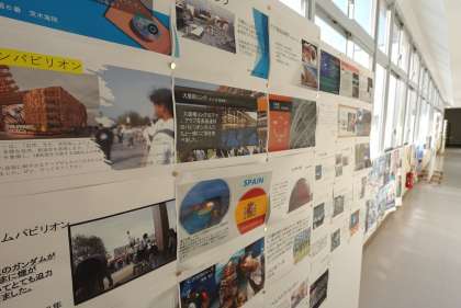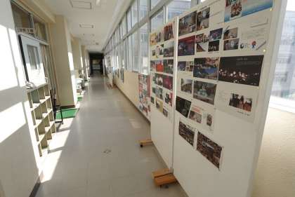 In the third-year corridor, reports about the Osaka–Kansai Expo, which students visited on a recent field trip, are on display.