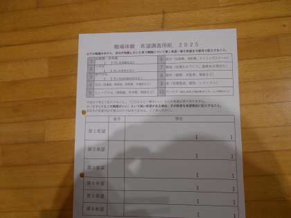 来年の2月5日・6日に予定されている職場体験学習に向け、2年生を対象に希望調査を実施しました。今回は、生徒たちが自分の興味や将来の進路をより具体的に考えられるよう、仕事を「幼稚園・保育園」「小学校」「専門学校」「公共」「ミュージアム」「体力」「製造」「販売」「食」「サービス」の10種類のジャンルに分けて調査を行いました。
