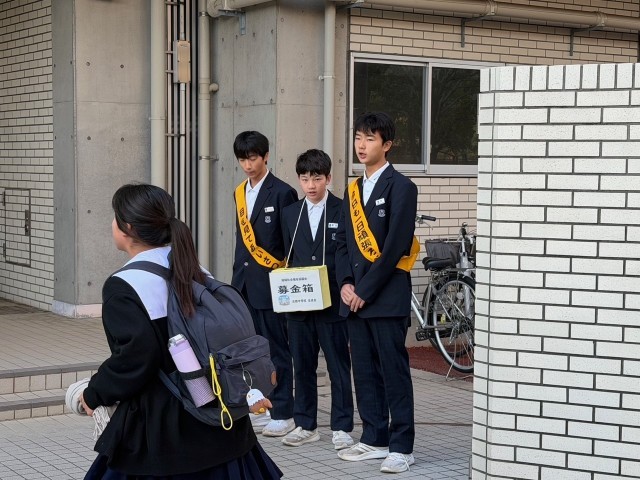 今朝から、生徒会執行部の生徒が、募金箱を持って正門前に立ち、地域活動協議会の募金活動に取り組んでいます。
