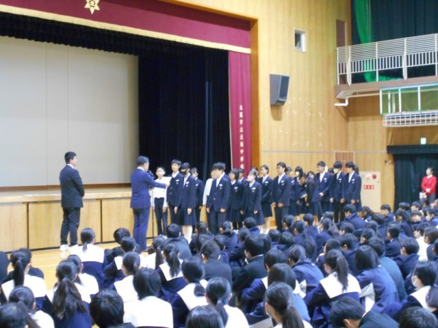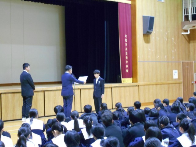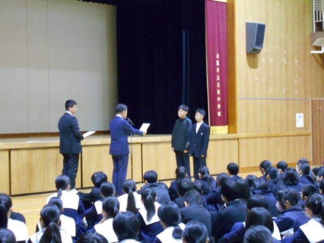 体育大会では勝ち負けを超えて仲間の頑張りを応援する姿に胸を打たれたこと、2度の延期にもかかわらず大きな盛り上がりを見せた合唱、そして毎週の全校朝礼で伝えられる数多くの表彰から、生徒一人一人の日々の努力がとても素晴らしかったことが語られました。また、始業式で伝えた「隣の人を大切にする(アガペー)」という言葉を振り返り、現実の世界だけでなくネットの世界でも、相手の気持ちを考えて行動できているか、自分を見つめ直してほしいとの呼びかけがありました。最後に、3学期は次年度に向けた準備期間として、さらに成長していくことを期待するとのお話がありました。