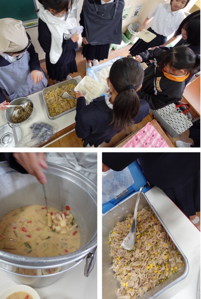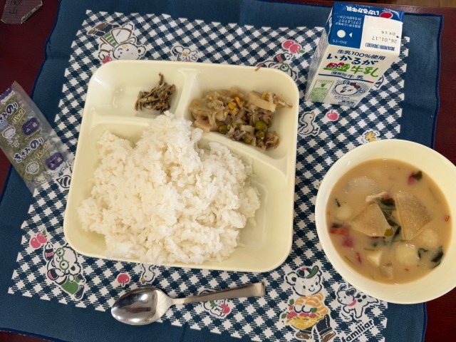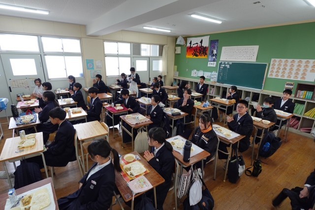 1-1では、久々に級友と囲む給食が一段とおいしく感じられ、笑顔で「いただきます!」の声が響きました。